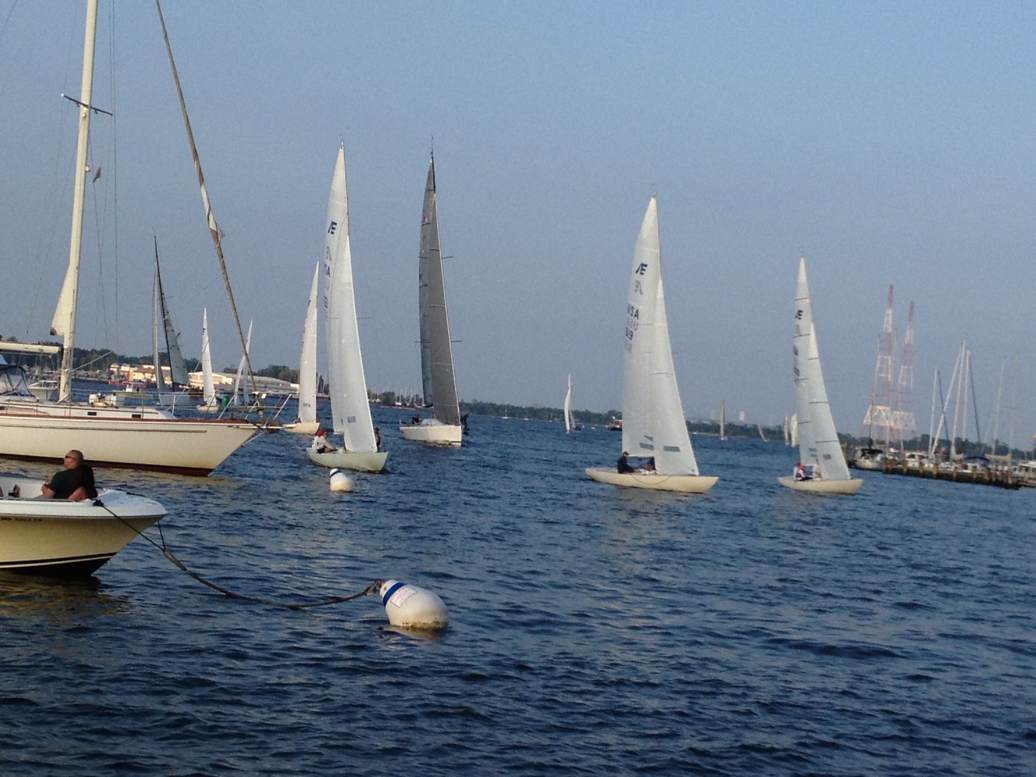 We spent the next night with Jimmy on a mooring ball in Annapolis Harbor watching the Wednesday night races. Wednesday night races are made up of a variety of amateur sailboats of various sizes. The finish line is at the end of the harbor. The mooring field is fair game. If you don’t know what a mooring field is, it is a bunch of big floating balls that are anchored to the floor of the body of water. A boat can just pull up to the mooring ball, gracefully (ha!) snag the rope attached to the top of the mooring ball with a long-handled boat hook and attach it to one of the cleats on your boat. It is easier than anchoring and generally more secure. There is usually a reasonable fee to secure a mooring ball for the night. But back to the races: so these sailboats (remember, they don’t maneuver quite as precisely as a power boat) come FLYING THROUGH the mooring field racing to the finish line! There are lots of near misses to excite the crowd and it is really cool to watch! Below are some shots of the races and our travels with Jimmy. We ended the evening with the three of us having a jam session in the cockpit, Jimmy and Frank on guitars and Ems attempting to sing. At one point we had a 12 bar blues riff going and improvised our own tune called “The Annapolis Harbor Blues” (which is an oxymoron). There may have been rum involved, but I know for a fact there were Raisenettes.