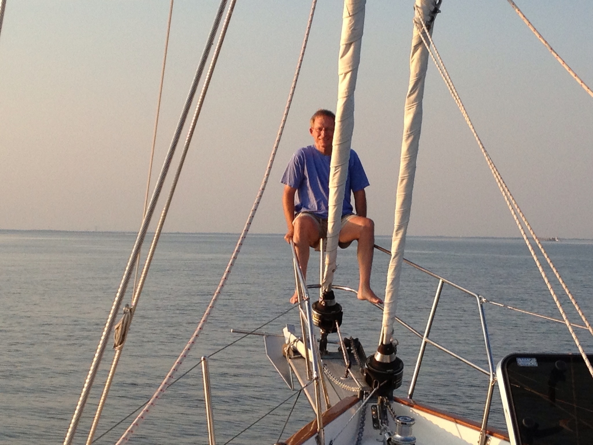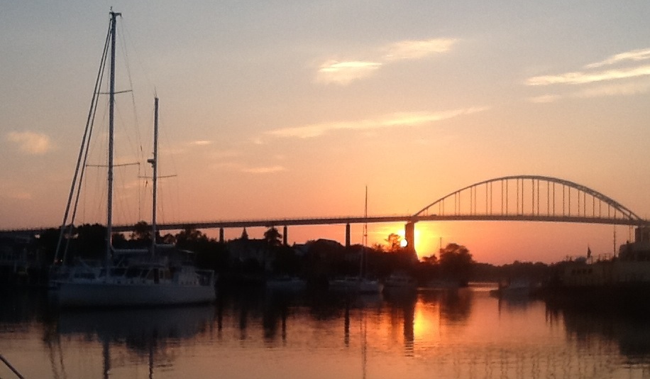 As the sun started to pop up, I decided we needed music on the stereo, so I started quickly assembling a short “Sunrise” playlist on the iPod. I was able to grab Norah Jones’ “Sunrise”, “Sun King” by the Beatles, followed by “Here Comes the Sun” (of course!). Any helpful suggestions on what to add to the playlist for the next early departure would be greatly appreciated! The trek down the bay was uneventful and pleasant, although not much sailing and a lot of motoring involved. We did get the main sail up to help the engine for a while when the wind direction was cooperative. About seven hours later and we were in Cape May, home town of Captain Frank Edward Quigley. He pointed out the spit where he sank the Marjorie Snow. I won’t share that story on this blog. Frank will be mildly relieved, but I’ll be disappointed. We’re slightly different that way.