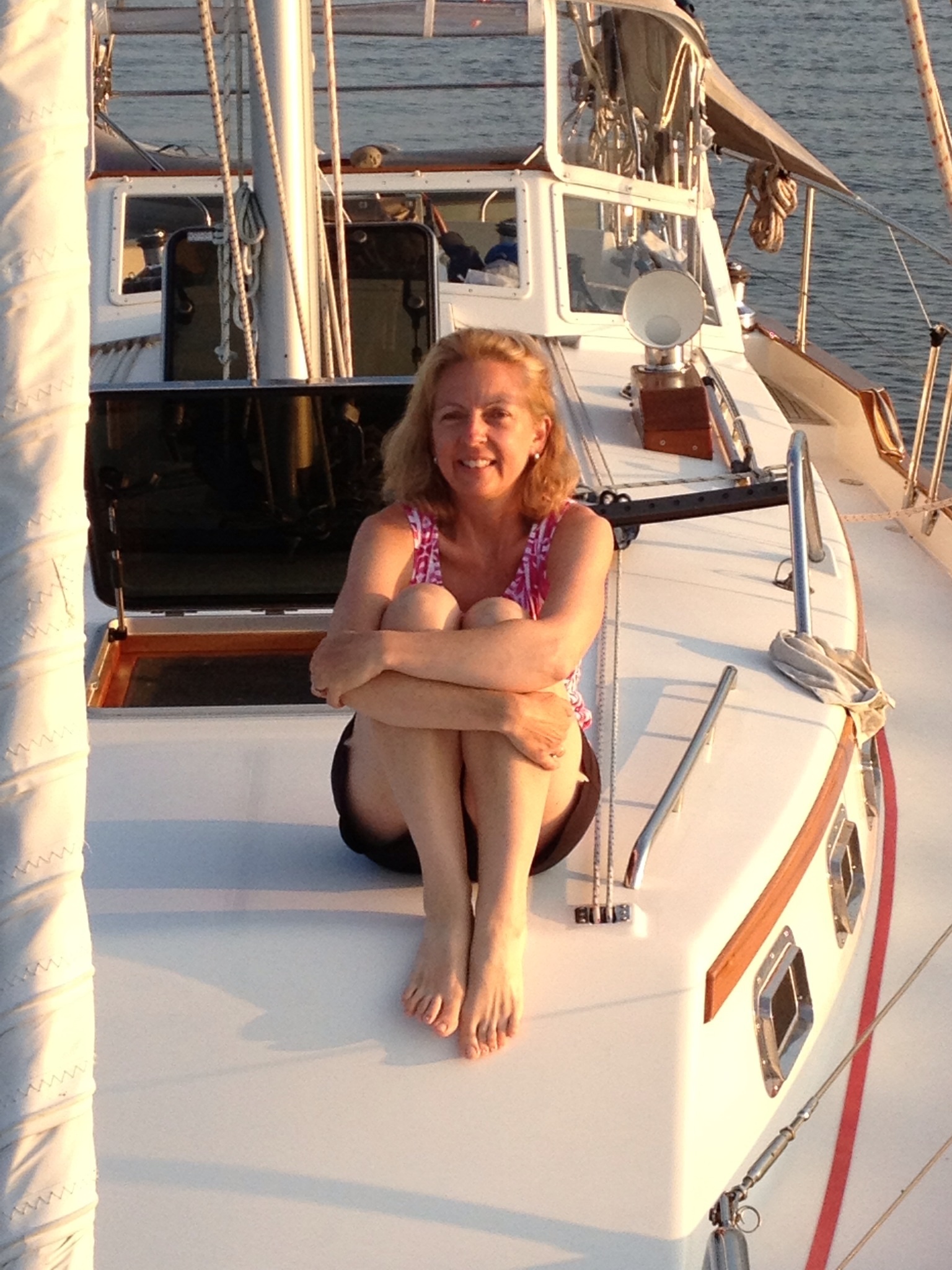 If you had more than two people or if both were very experienced crew who do this kind of passage all the time, you would actually get opportunities to sleep. But we knew we both wanted to be in the cockpit the whole time and figured we would relieve each other and take catnaps, which is what we did. (Frank’s were little bitty kitten naps. Mine were large Maine Coon Cat naps.) Anyway, here’s the overview of what it was like: The weather was pretty good, the winds were good for more than half of the trip, the temperature change from day to night with wind and humidity called for everything form bathing suits midday to all the layers we could find complete with socks and hats and big coats overnight. It is an open cockpit, so no hiding from the elements except for the canvas canopy that covers part of the area. The ocean was acting like an ocean . . . a little rocky and rolly – which doesn’t stop at any time. I’m so used to the Chesapeake Bay which is very calm by comparison. At one point I said something innocently like, “Are these kind of bigger swells?” I derserved the answer I got, which was, “They’re waves. It’s the ocean. The ocean has those, you know?” I had it coming to me.