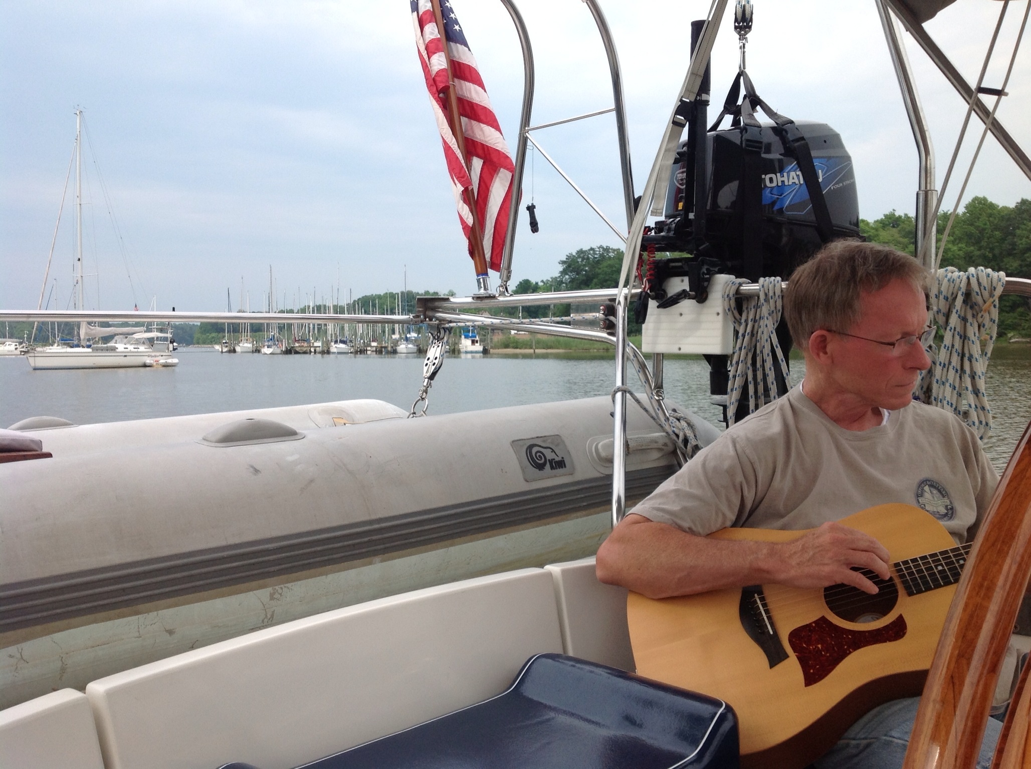 Happily for us, the squall went around us . . . we watched it. It slid on by just throwing a few sprinkles our way as it went. I was mildly relieved. I think Frank was a little disappointed.We’re slightly different that way. The squall was nice enough to leave us with some nice wind, and we were able to put the sails back up, turn the engine off . . . ahhhhhhhhh, . . . quiet! . . . and enjoy some good air for part of the trip. We decided to take our new friends on Freebird up on the offer to meet up in Worton Creek, so that’s where we headed. The first time we talked to them, we asked them why the name Freebird. “Lynyrd Skynyrd . . . Freebird. You know!” We did indeed; just didn’t want to assume they were Skynyrd fans, you know? So we anchored up right beside them, chatted across the water and agreed to meet for happy hour. Being the new cruiser, I asked an ignorant question: what time? I got the same reaction I got the first time I asked Dave that question in Oxford: “5:30!” said in a very kind but surprised voice, like, “Come on . . . you have to ask?” (Several days later in Cape May, a boat invited us over for cocktails. I asked, “What time?” Answer: “5:30!” When will I learn?) We parted ways for the rest of the afternoon to do our own things on our own boats. Frank and I broke out the guitar and tried to learn “Freebird” to seranade them later. Yes, I was trying to sing Freebird . . . you can only imagine how inauthentic that was, but it was fun all the same. In the end we chickened out from trying to do the whole, live version for them. Decided we weren’t quite ready for prime time. I think Frank was mildly relieved. I was a little disappointed. We’re slightly different that way.