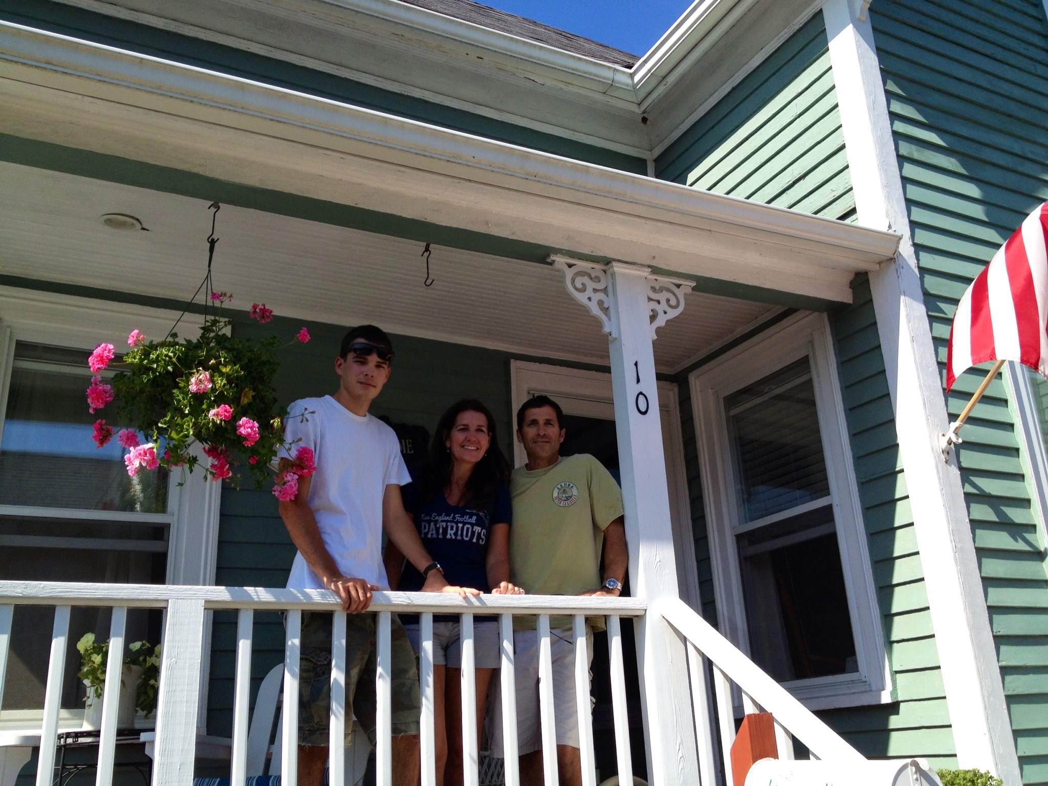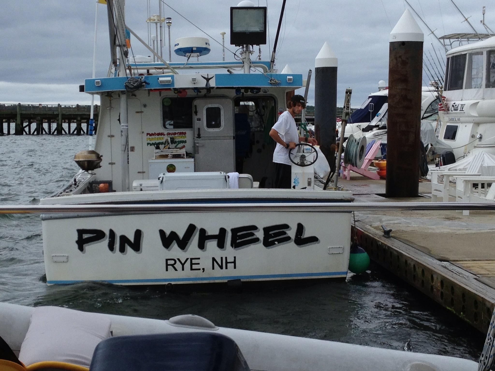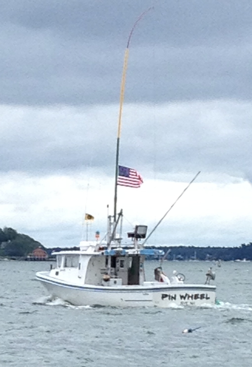 It was finally time to say goodbye to Maine. We knew we had about a ten hour trip ahead of us to get to Gloucester so we left at sunrise. Along the way we saw a seal pop his head up and check us out for a while! Finally! We may have seen a grand total of 8 seals the whole time we were in Maine! And – at long last – we spotted two whales that day!! We think they were Minke Whales . . . not too big and could be mistaken for a dolphin swimming at the surface of the water until you realize it is much too large to be a dolphin!! The sightings were brief, but exciting. We took two hour shifts, it was warm, and we were going downwind, so it was a comfortable ride other than the flies that wanted to make the trip with us. Ten hours flew by, and then we were pulling into the harbor in Gloucester, another town with LOTS of Frank’s family to visit . . . but we’ll save that for the next post.