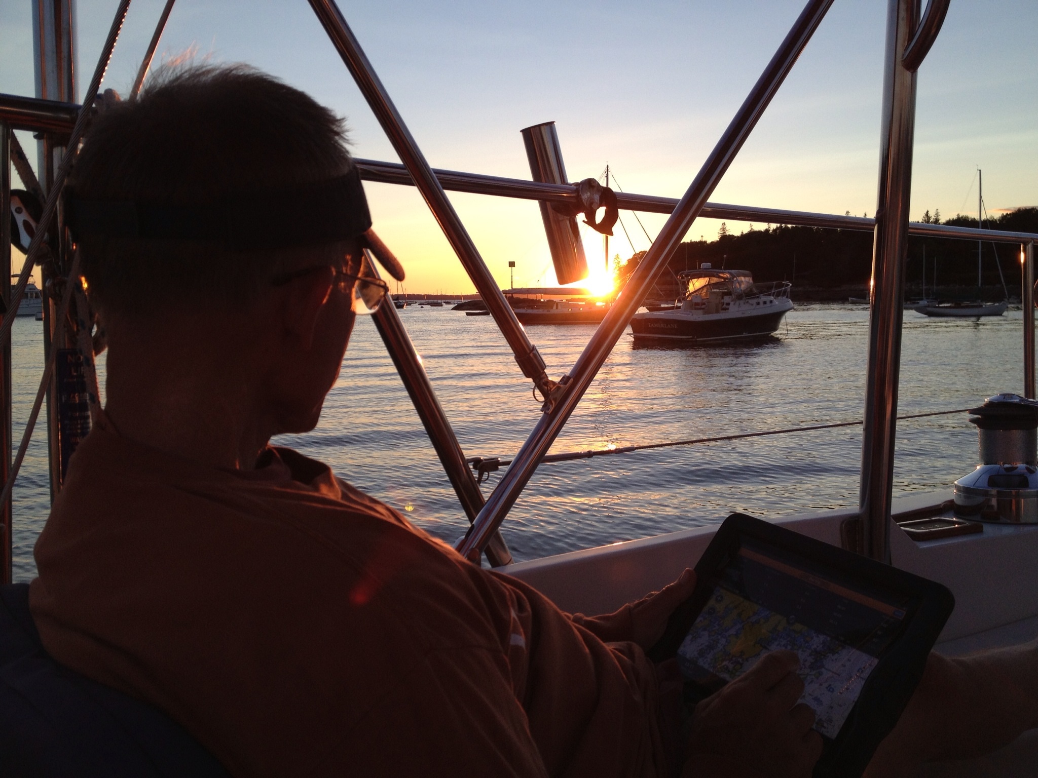 That was a big moment for us. We pulled into Northeast Harbor and made that our home base for the next four days. We had a new experience in the harbor: floats. We called in to the harbormaster to see about getting a mooring ball . . . they were all taken, but they had a float available. A float is like a little, tiny floating dock just about the length of a boat. It is, like a mooring ball, anchored to the floor of the body of water, but it is a mini-dock. You get one side of it and another boat gets the other, so you have one very close neighbor. One thing we have discovered: the “knucklehead factor” up here is pretty low, so you’re not worried about having “Fuggedaboutit” pull up beside you blaring Pit Bull (no offense, Pit Bull fans). We found it very comfortable, quiet and good sleeping. Our first night there, a dinghy came riding over with two familiar faces: a couple we had met at the gam! They invited us to come for “sundowners” on their boat. It was a great way to wind up the day, and they had lots of helpful information about getting around the area.