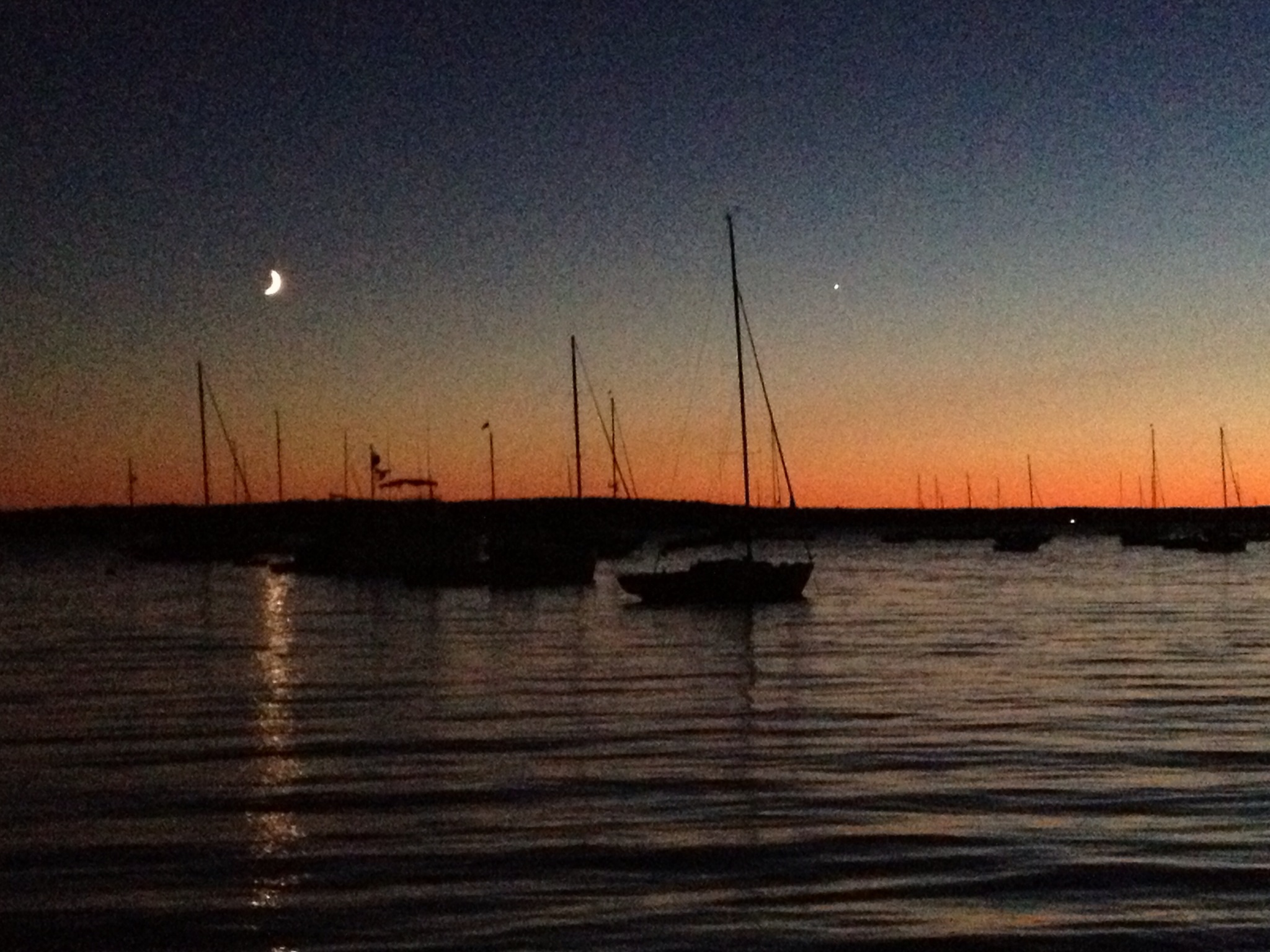 And the unsettled weather moved in as predicted. That morning was the first time we actually got up and unplugged anything that was plugged in and charging (phones, computers) for fear of a lightning strike. Then we rolled over and went back to sleep . Not much you can do at that point! All was well – no direct hits. We listened to it rain hard for the day and took advantage of the time to read/nap/catch up on bills and correspondence, etc. Sometimes a forced down day is a good thing. We actually didn’t mind. And it was a very scenic harbor!! After a day filled with rain, the skies cleared for the most beautiful night with the sky lit up with stars. Amazing what lack of lights will do for star gazing!