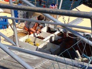 Earlier when we got in to harbor, we picked up a mooring ball that we thought belonged to the marina. It seemed to fit the description. Frank at the helm, I went to grab it on the bow. The rope felt kind fo slimy when I was pulling it up, which was very odd. I got hold of it and was just putting the loop on the cleat to secure it when I realized that the “slime” was moving! It was thousands of little tiny crabs and mussels and other living things. I try to “put my tomboy on,” but I am not a fan of crawling things – I admit it. Fortunately, I already had the line hooked on the boat when I realized this, therefore preventing me from dropping it in the water! I hope the yelp I let out was a little, private one. Frank came up to assist and survey the situation. Now we had little crabs trying to crawl onto the deck. Nothing that the wash down hose couldn’t fix, but more importantly, that told us the mooring ball hadn’t been used in a very long time, which struck us as odd. Come to find out, we had mistakenly pulled up to a privately owned mooring, which the nice young man at the marina informed us when we told him what number we were on. He didn’t care. He said, “You can stay on it – just be prepared to move if the owners show up.” Judging by the ecosystem on the ropes, we figured we didn’t have to worry about that! And so we saved $35 on our mooring ball that night.