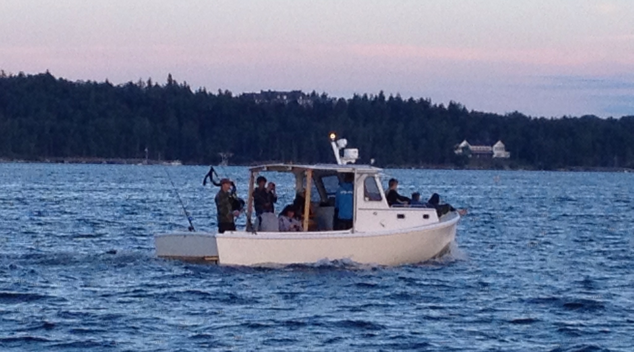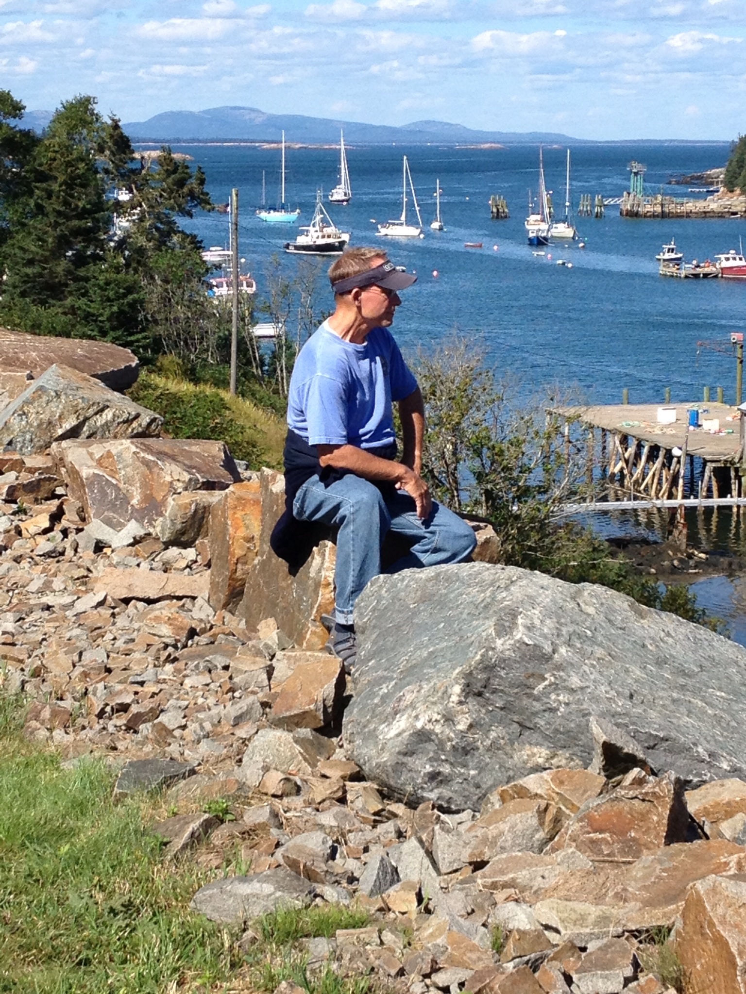 Ems up on the bow as we come into Northeast Harbor with Mt. Desert Island in the background. A big moment!!