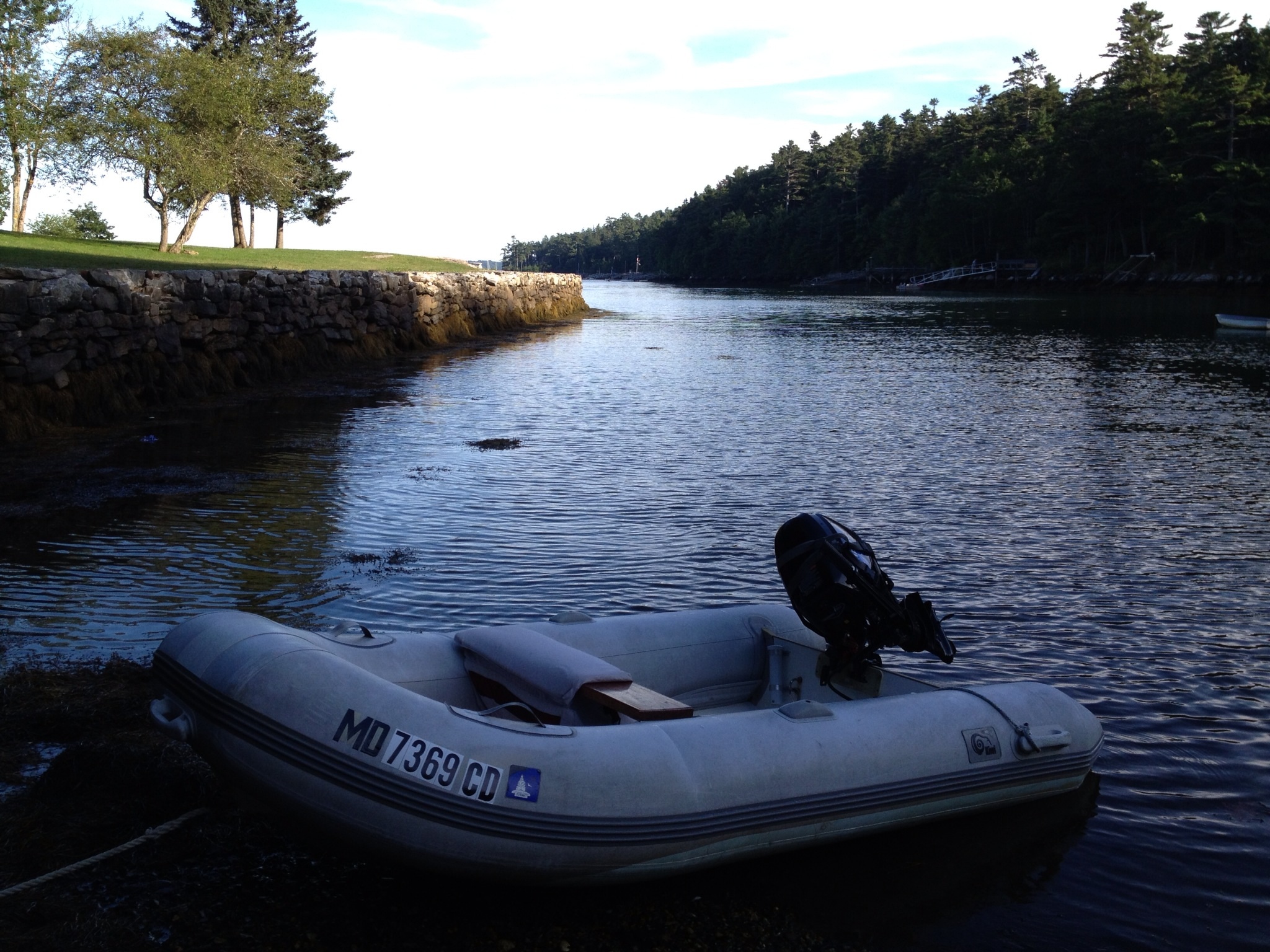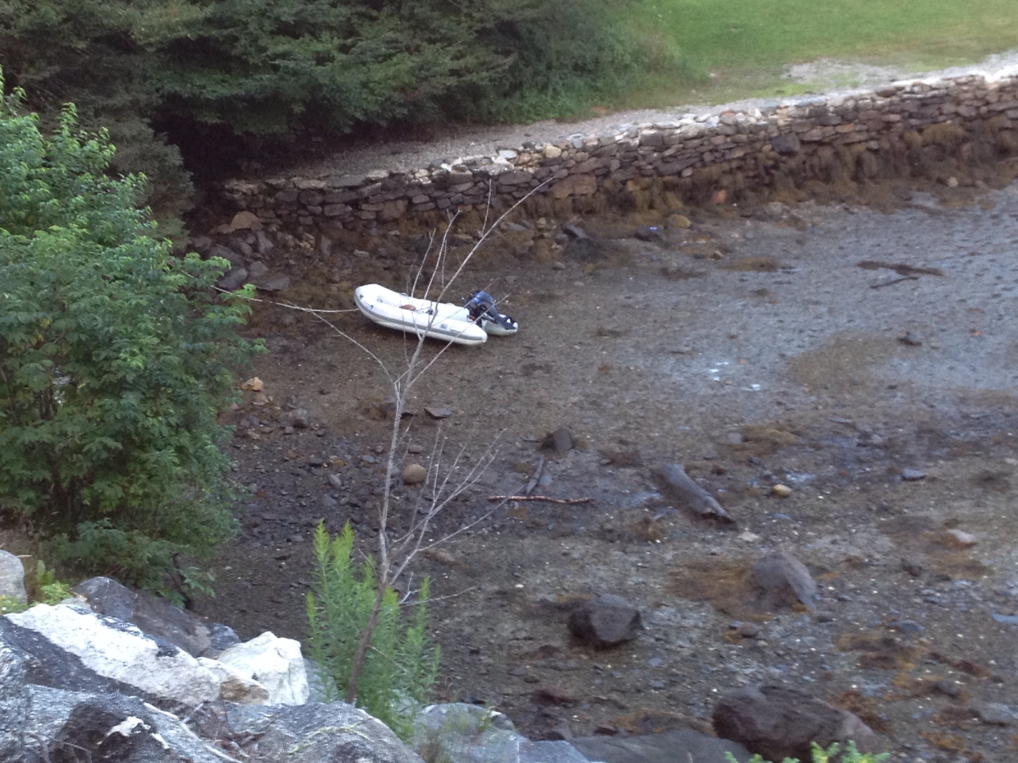 Because Boothbay can be very crowded in the summer, we opted for anchoring in a cove around the bend known to be a quiet anchorage. After the rocking and rolling in Portland, we were ready for a quiet anchorage! We found a beautiful spot in LInekin Bay. We had read about a park at the head of the bay where you could land your dinghy and then walk into Boothbay Harbor. Another thing that we had read about was the 10 foot difference between low tide and high tide . . . a swing that we are not so accustomed to. We considered that very carefully when we were anchoring, being sure to think about how much water we would be parked in six hours later. But when we took the dinghy to shore for a walk, we didn’t give it quite as much thought. The following pictures tell the rest of the story.