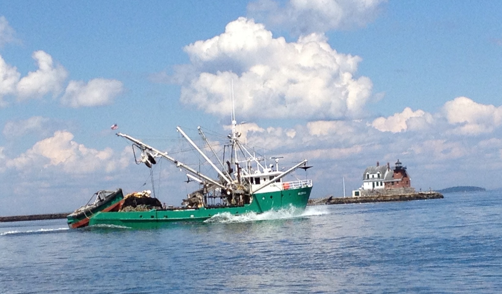 A beautiful seiner (type of fishing vessel) going by Rockland Harbor Breakwater Light as we’re coming in to port.