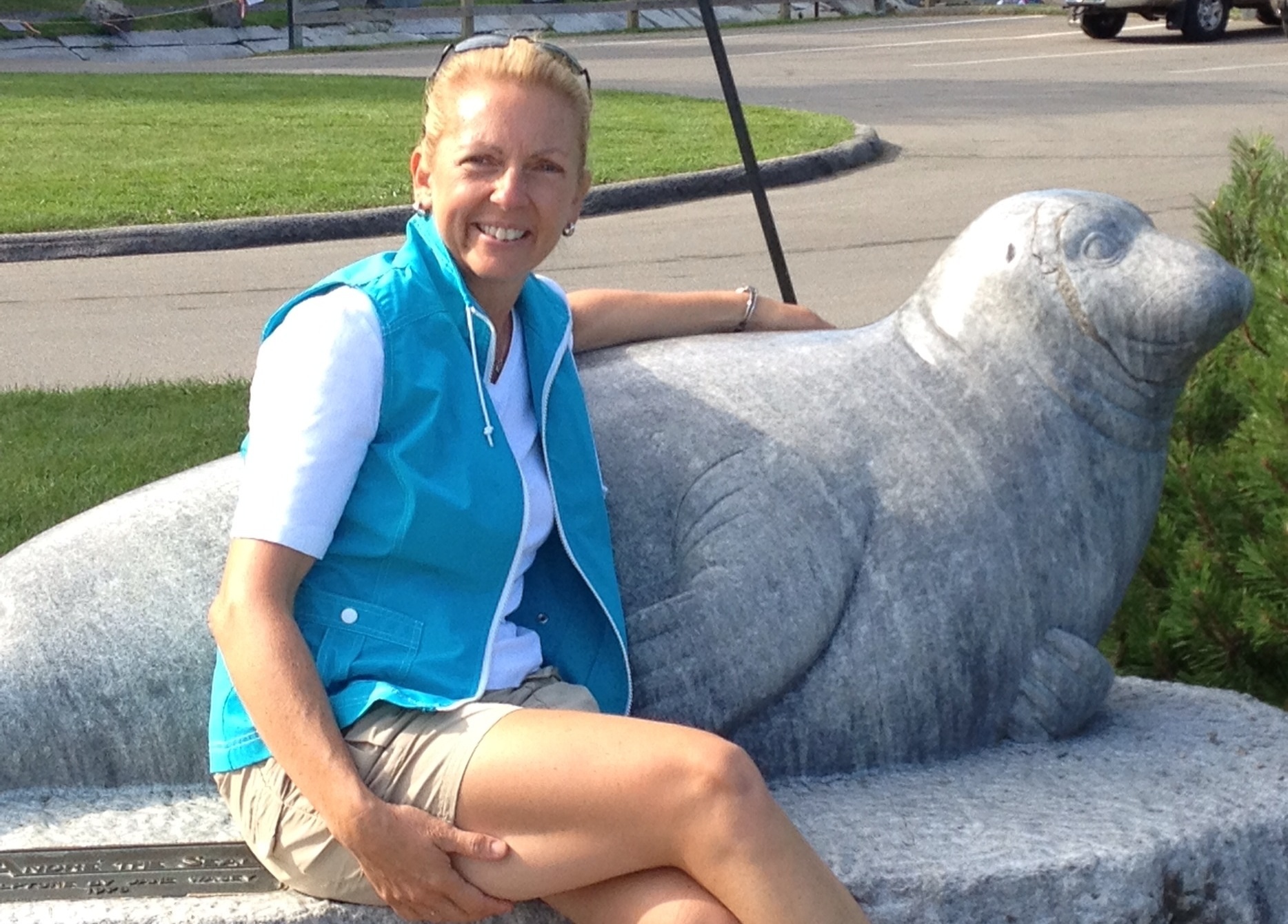 A Statue of Andre the Seal. A 9 year old girl adopted an orphaned seal and named him Andre. The story became a book which became a movie in 1994 . . . and here Ems is having her picture taken with a movie star.