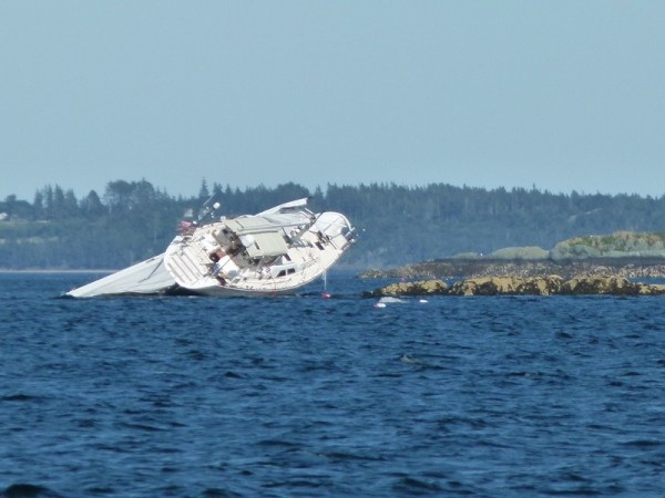 While underway, we heard a distress call on the VHF radio . . . a boat named Archangel was talking with the Coast Guard. We could only hear the Coast Guard’s side of the conversation, but it sounded like they had hit something and disabled the boat. Everyone on board was safe and help was being sent to assist the boat. We could tell it had happened fairly close to our location. When we got back to Camden and picked up our mooring ball back at Wayfarer Marina, the staff was all abuzz about the boat the had run aground. It was the boat we had heard on the radio, and it was coming in to the marina. They said it had been demasted, which is exactly what it sounds like – the mast snapped off in the impact. That is a heck of an impact! The next morning when we were taking Triana to shore, we saw Archangel parked at the dock. Oh my goodness. She’s a 70 foot Hylas (meaning big and beautiful) and sure enough, the mast was snapped right off. Just made your stomach turn. They had been under full sail and hit a big rock. Amazing no one was hurt. It was another reminder that you can’t lose your attention when you’re out on the water! Amazingly, the boat was able to be uprighted and come back in under its own power.