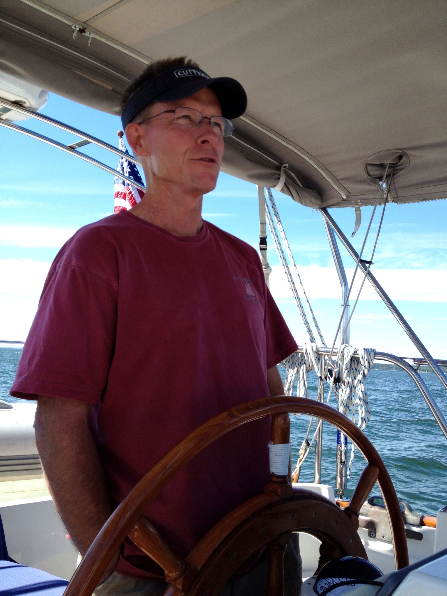 It is called a “reach” because the way it is positioned and the direction of the predominant winds, a sailboat is almost always on a “reach” (meaning with the wind hitting the boat broadside) which is the most desirable point of sail. The weather was gorgeous and, best of all, the lobster pots subsided for a while!! My friends, we did something shocking. We put up the sails and turned off the engine – a rare experience in these parts for us! Sun, warmth, wind, no pots – that makes Frank very happy. Here’s how happy it made him:
