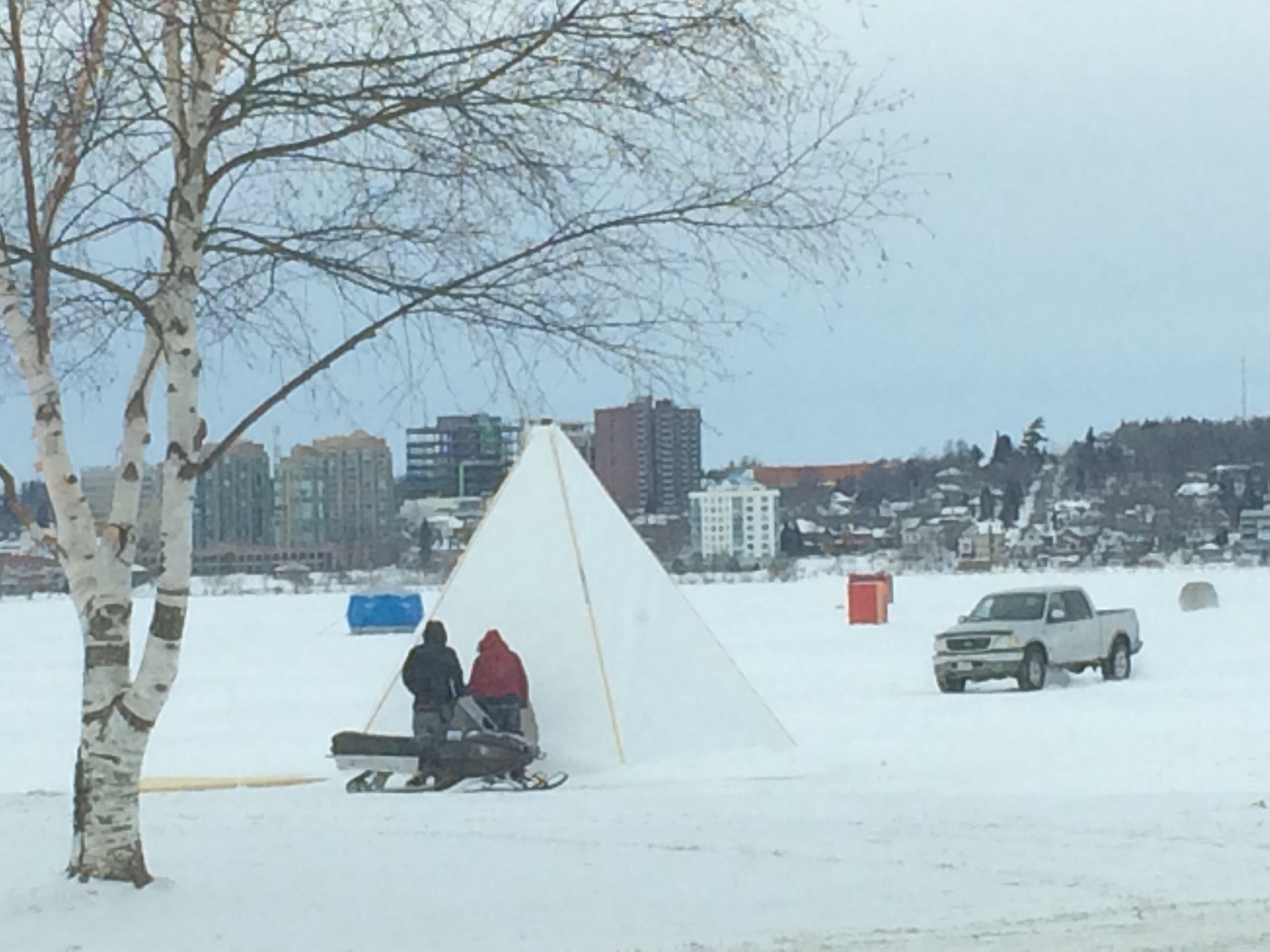 The town of Orillia is surrounded by lakes! In the distance there are snowmobiles and and ice fishing huts. Yup, that’s the lake.