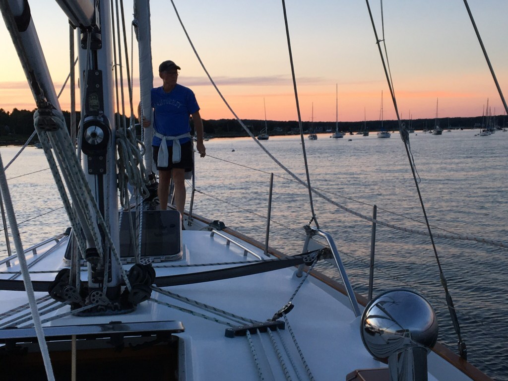 We were carefully instructed that the last launch would be at sunset… so we made sure we were back shortly before, but Donna the launch driver said, “You’re going to need to wait a few minutes. I have sundown duty.” No problem, Donna. Sunset duty means setting off that proverbial canon and lowering the flag. There was a small “bang,” and I said to Frank, “That’s a pretty wimpy can—-” and before I could finish, the real canon was fired. When I regained my hearing, I shouted to Frank, “Oh! They have a real canon!” The flag was lowered, properly folded and stored all while anyone anywhere close by stood in quiet respect. How nice. We like this New England tradition. Call me old fashioned! See, there is plenty of civility in New England.
